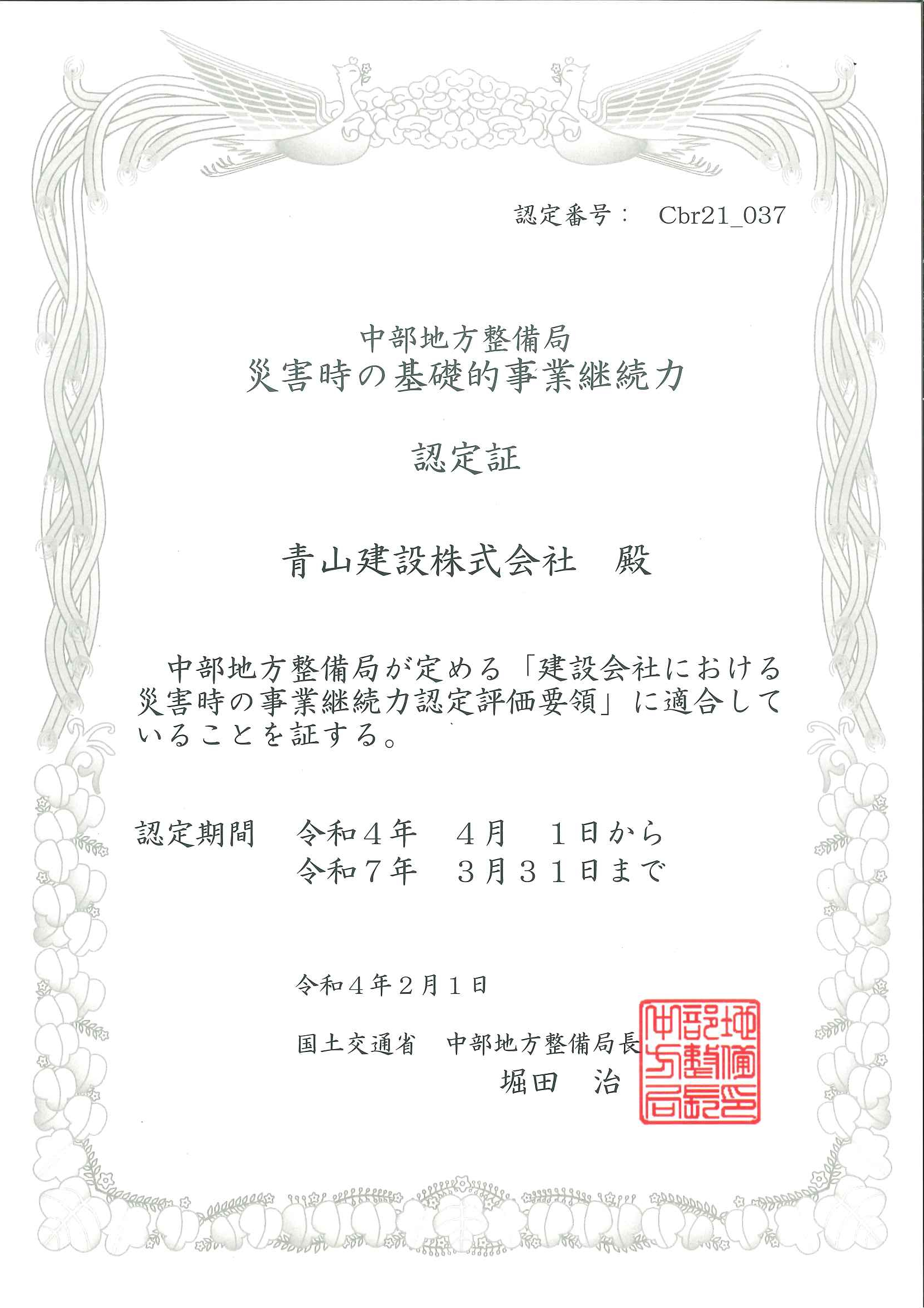 2022年2月1日付、中部地方整備局長より「災害時の基礎的事業継続力」が認定されました。