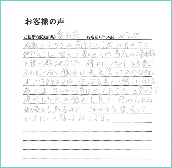 我家にチワワの花音(ハノン)が、11月の末に仲間入りし、主人に勧められて貴社の浄水器を使い始めました。